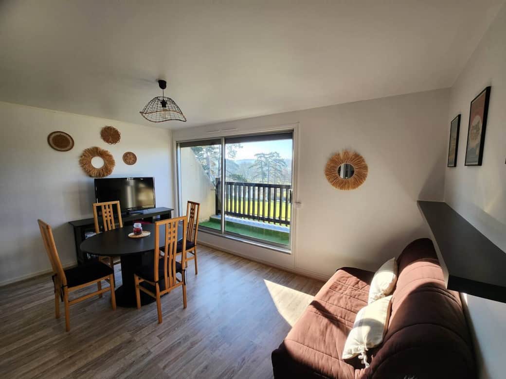 La pièce à vivre comporte une cuisine aménagée et équipée (cafetière Nespresso, lave vaisselle, micro onde, plaque, frigo, grille pain...), une table à manger, un clic-clac servant de couchage (140/190) pour 2 personnes, et une grande télévision de 102cm.